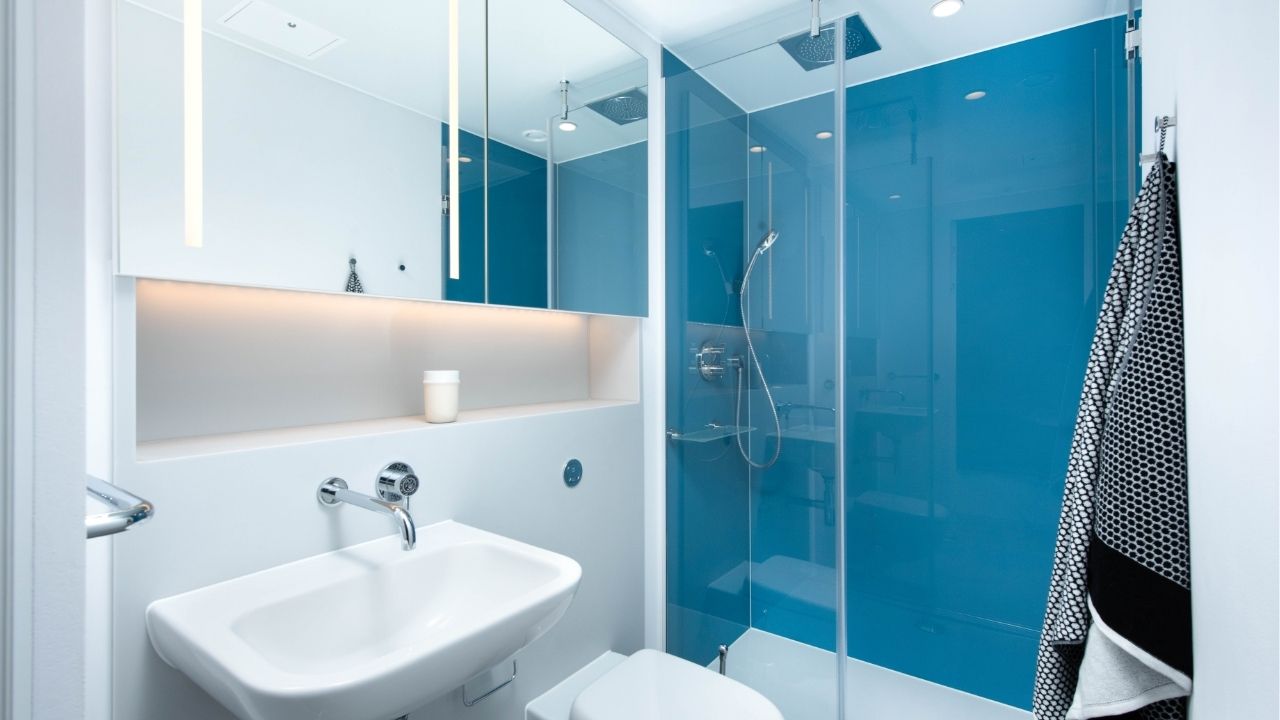 Your studio apartment comes with your own private bathroom featuring a high pressure rainfall shower, built-in mirrored storage and designer bathroom suite. The bedroom has a double bed with an upholstered headboard, a comfy mattress, bespoke wardrobes, built-in bedside tables and lift-up storage.