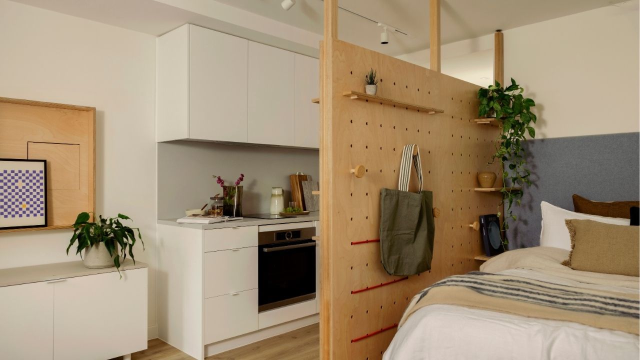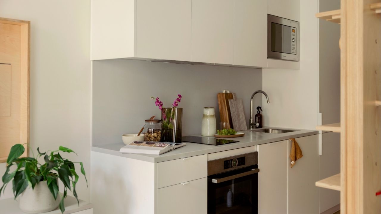 Your living space has wooden floors, luxury curtains, super comfy sofa, dining table and chairs, bespoke fitted storage, a TV console, a plant from Patch Plants and a Sonos speaker. Your new private kitchen is set up to make cooking (and cleaning a dream) with a grey Corian worktop, a built-in fridge and freezer, dishwasher, microwave, oven, induction hob, and smart storage.