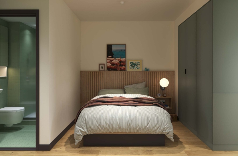 At The Altham, furnished means more than just the basics. Every studio comes ready to live in, with a double bed and pocket sprung mattress, double wardrobe, plenty of built-in storage, and a private bathroom with vanity unit.